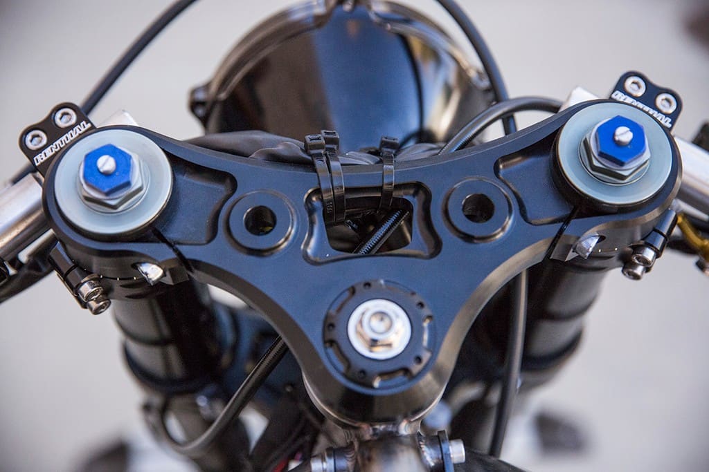Molti componenti derivano dalla moto realizzata per la Pikes Peak e dalla Panigale (leggi qui: Ducati Panigale: la versione di Roland Sands Design): le performance nella Scout non sono un elemento secondario.